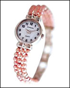 表链由淡粉色的珍珠相串而成,细腻、温润,展现了巨蟹MM 水一样的温柔、丝一般的体贴;圆形表壳的复古设计,不禁令巨蟹 MM 回忆起金色的往昔;清晰的黑体数字时间刻度,模仿家中的挂钟而成,让巨蟹 MM 随时随地都能感受到家的温馨。