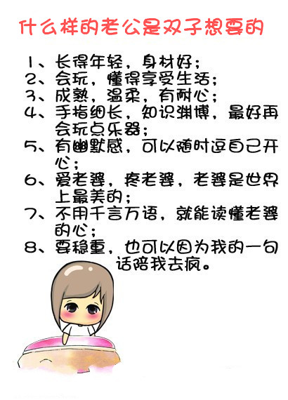 双子的稚嫩,当然要有个稳重的好老公护着。只是双子不希望老公太死板,会陪自己玩、陪自己疯,哪怕只是玩笑中很随意的一句话,也会努力的做到。