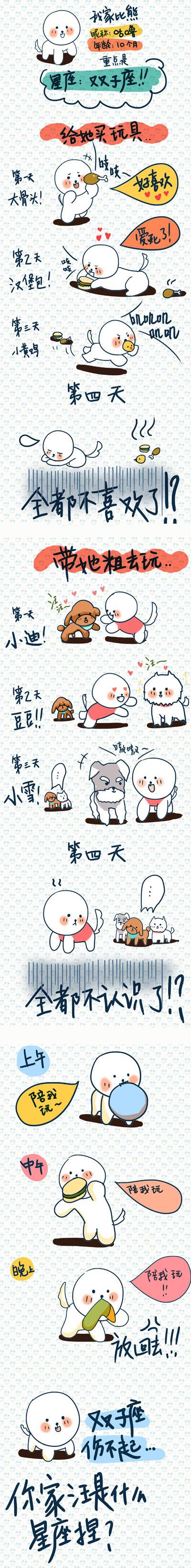 【导语】今天星座屋小编给大家带来一组内涵漫画哦!是什么?讲述双子座的汪星人(就是双子座的小狗狗),究竟有什么特别的呢?跟双子座的人性格又有什么区别呢?下面跟随星座屋小编一起来欣赏一下这一组漫画。你家的小狗是什么星座的呢?