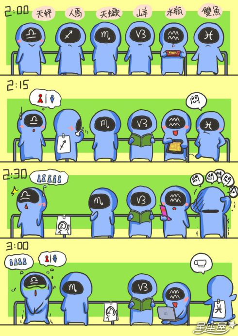 用一个小时的漫长等候测试十二星座的性格,小编本人觉得实在太准了啦~假如你在一小时的漫长等待中,你会有什么反应呢?跟随星座屋一起欣赏下面的漫画图吧!