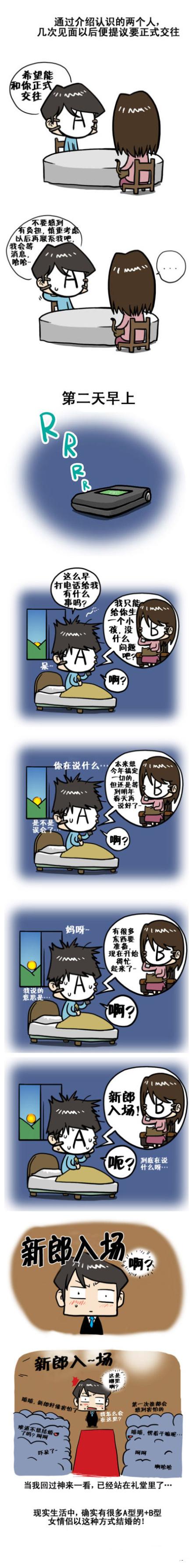 【导语】相亲不一定是以前老一辈时代才有的事情,在现代社会,相亲也是一件很普遍的事情,而且现在的人大部分时间都用在工作上面,没有太多的时间接触其他的人,所以相亲很自然就成为其中一种结识伴侣的方法。这次星座屋小编就A血型和B血型人的相亲故事来说说,看看当这来两个血型相亲时候会发生什么趣事,他们可否走到一起呢?是漫画版的哦!
