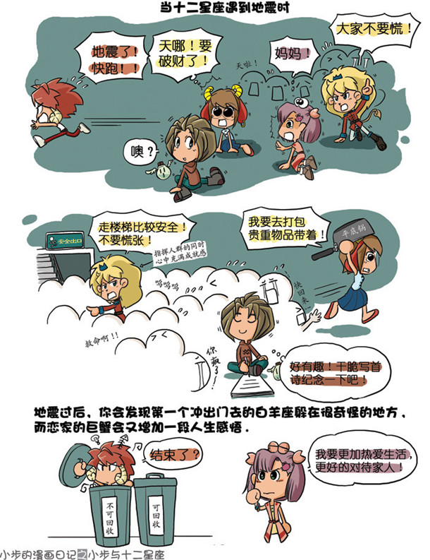 当遇到地震之时,我们该如何自护呢?星座屋给大家带来星座漫画(小步版漫画),看看当十二星座遇到地震时,会有怎样的反应。采取的行动是否正确?
