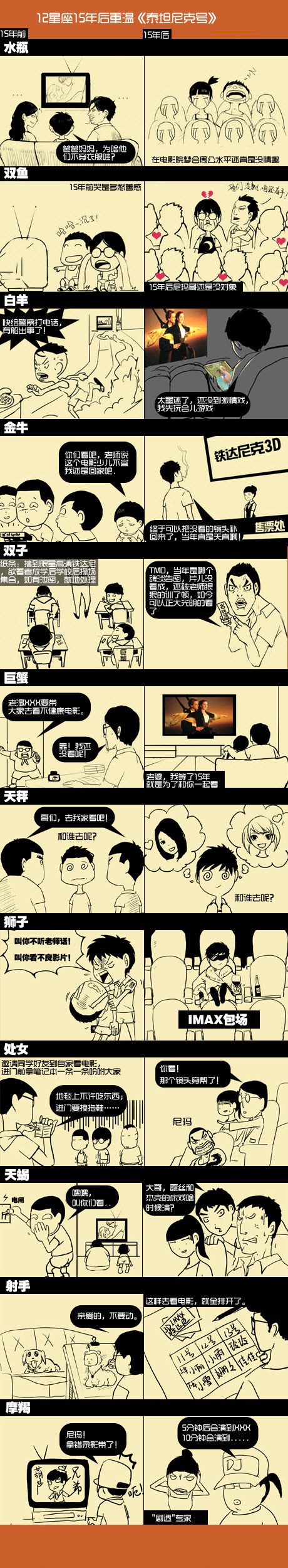 【导语】美国著名电影《泰坦尼克号Titanic》是1997年的老片,或许有人特怀旧,有人却一点也不感冒。当十二星座在15年以后重温经典,不知道会是什么样的感觉呢?下面是星座屋小编带来的星座漫画,看看十二星座的反应。