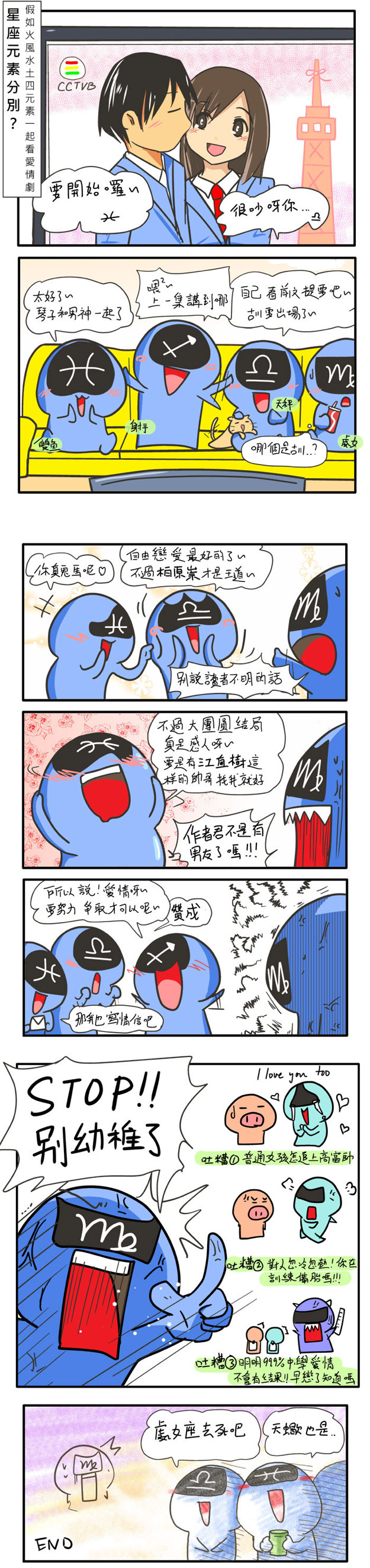 【导语】星座屋今天和大家分享一则漫画:当四大相星座一起看电视剧时,只需要从简单的言语或者动作,就能够分辨出谁是风相、水相、火相、土相星座了哦!