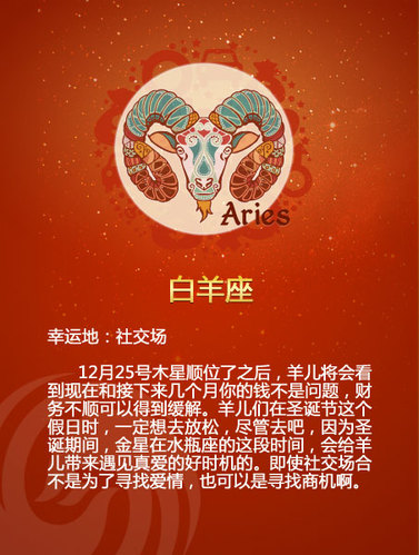 【导语】圣诞节,是末日后的第一个节日,这么欢乐的日子难道你还要窝在家吗?小编觉得应该要好好利用这个日子来庆祝一下人类的重生,所以一定要好好庆祝一番,即使不庆祝也要出去感受一下气氛啦!但是你可否想过要如何度过,在哪里度过?如果你现在还没有主意的话,星座屋专家今天就给十二星座一些建议,让大家过上一个开心欢乐又温暖无比的美丽圣诞节!