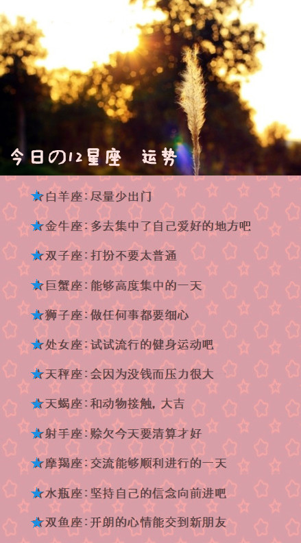 即使仅仅三天的短假,但假期综合症的程度还是一点不弱。但尽管如此,也不能让沮丧的心情耽搁了日子的美好。12星座的各个童鞋们,打起精神!!不如现在来关心一下自己这个周日的运势如何吧。让星座屋来说说今日の12星座 运势,带着好心情过上每一天。