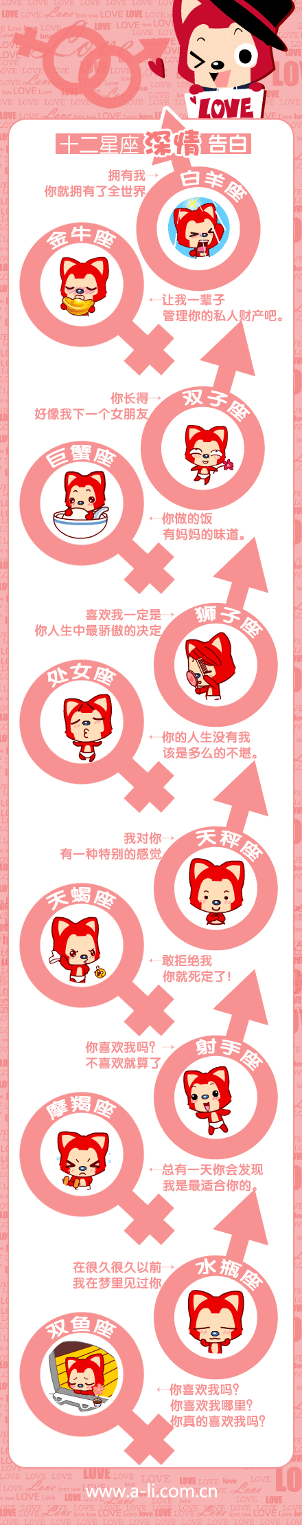 星座屋觉得阿狸很可爱,就找来了阿狸表现出的十二星座深情告白,供大家欣赏,一方面可以看阿狸的可爱秀,另一方面可以有趣的体会12星座爱的旋律。