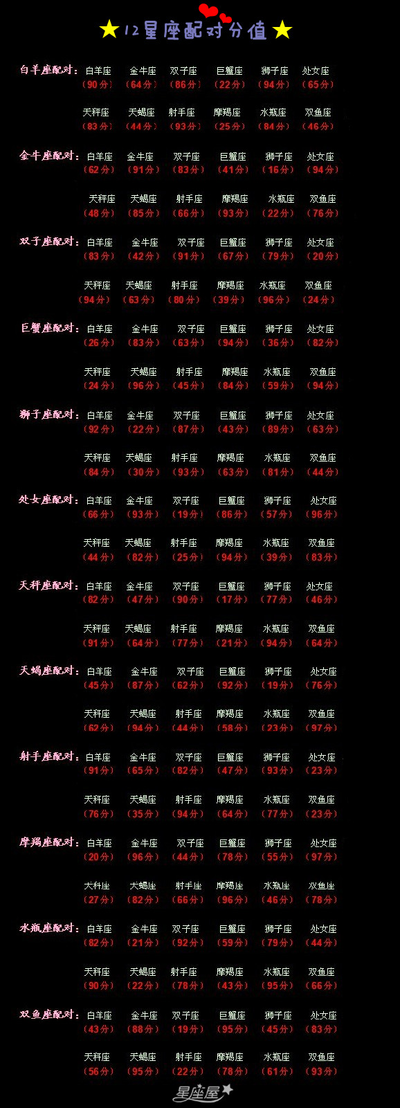 星座屋说说,12星座的配对,谁是你的最配对情人。快看星座屋给大家带来的12星座的配对分值陈列图,看看谁是人海茫茫里你要找的人。