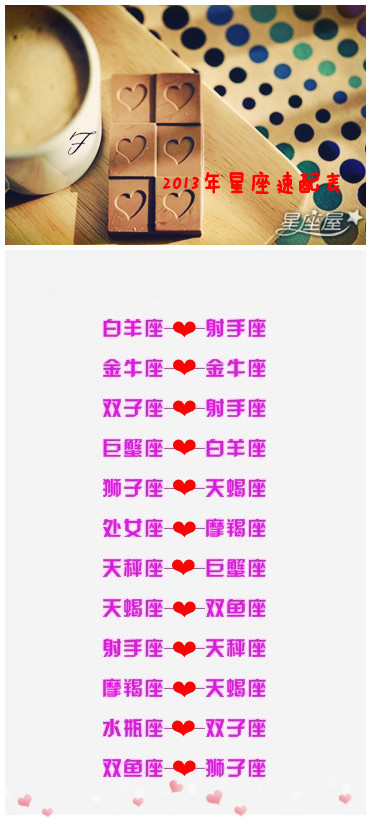 想知道2013年,你的爱情配对如何吗?就让星座屋在这里告诉大家,2013年星座速配表。看看你的最佳配对对象是谁吧!!