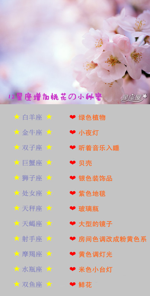 在这里星座屋给大家悄悄的透露一下,12星座增加桃花の小秘密。趁着这春天的美好风光,也让自己的桃花朵朵开吧!!