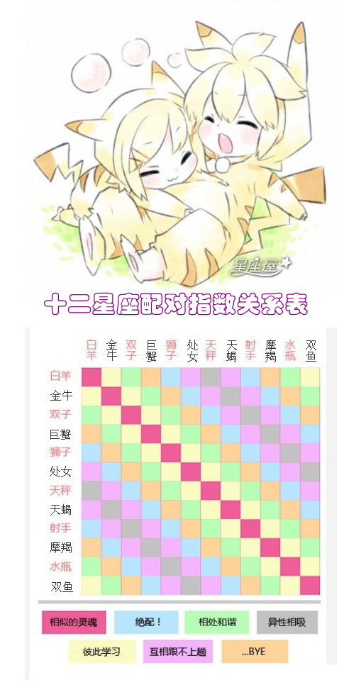 有关十二星座配对,从十二星座配对指数关系表,可以看到各星座与对应星座的配对关系哦。