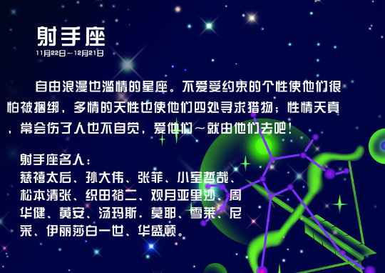 射手座 动作迅速,敢于实践。行动力迅速,勇于大胆的尝试。美中不足的是行...[详细]