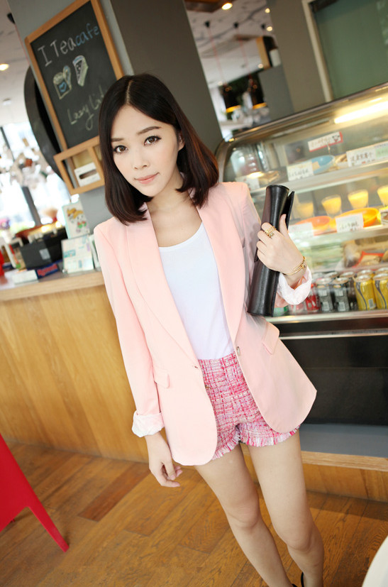穿搭造型:嫩粉色的修身中长款小西装配比衣服深一点的粉格子短裤,上搭白色的背心。
