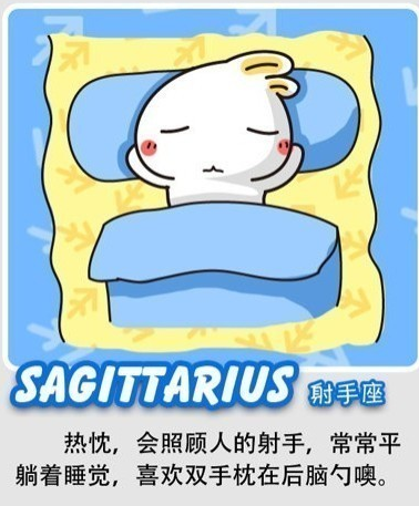 天生爱玩的射手座连睡姿也这么乐呵,把手放在后脑勺,哼着小曲,就这样无拘无束地睡去。