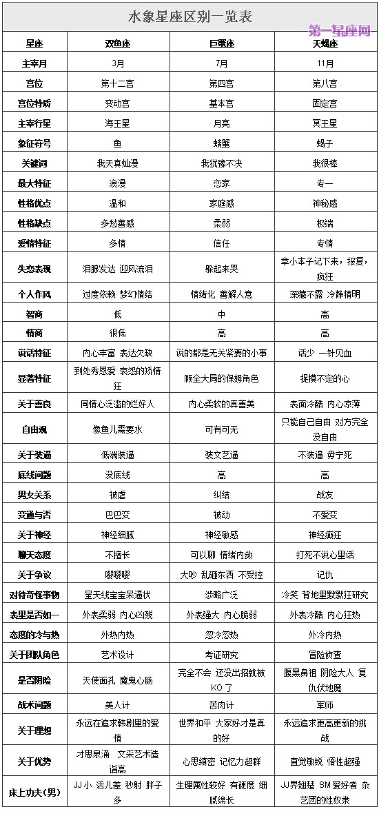 下面让我们根据这张表格来看看水象星座的不同之处吧。