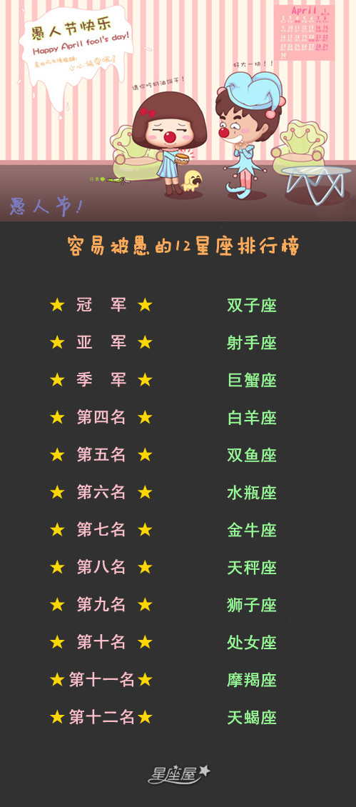 12星座也要来过愚人节咯!!在这里星座屋给大家说说,愚人节!容易被愚的12星座排行榜!!你的排名在哪里呀?今天你已经被愚了吗?