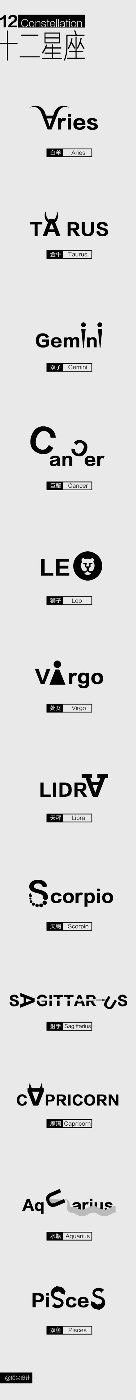 下面请大家跟随星座屋来看看以12星座英文名设计的12星座图。英文设计即大胆,又时尚特别,是很值得大家欣赏的一副设计创作。