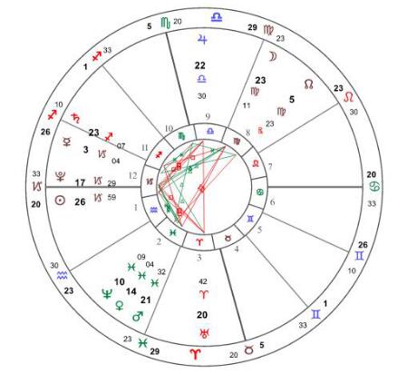 要说美中不足的是两个T三角构成的星象。一个由土星、火星、月亮组成,我在本周强调的双鱼座火星和射手座土星四合,这个星象轻则拖延、停滞,重则暴力独断,易有争执和交通事故,不是行动力不足,没有运动细胞,就是一生中较为劳碌辛苦,需要时时发力,消耗自己的能量和精力去完成某事,会比较适合运动员、创业族、投资者等带有冒险特质的事务(虽然也可以说特警,但是怎可能)。