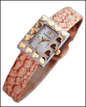 矩形的宽大表壳,四周镶嵌金黄色桃心,给人稳重、奢华之感,突出了金牛 MM 踏实、追求美好物质的天性;古铜色的表带,绘有旧式纹理,分层渲染,宁静安详,尽显金牛 MM 的典雅气质。