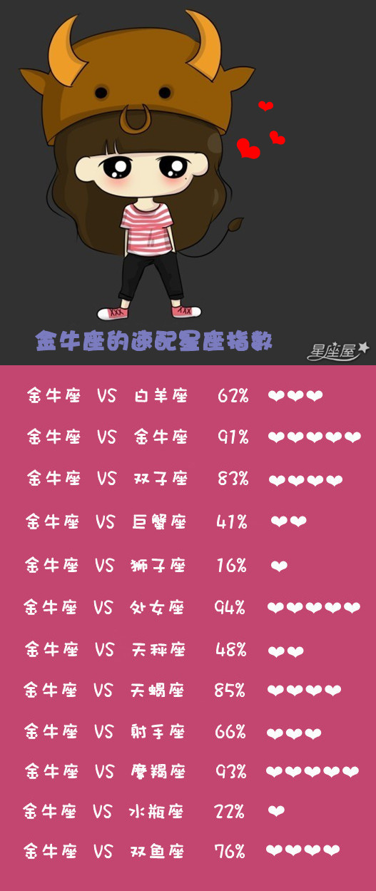 金牛座的人其实还有很多地方值得大家去欣赏的,尽管金牛有点点固执,但这属于个性的他的特点。得到相互的了解,自然能相处得好好。金牛可不是蛮不讲理的人。下面就让星座屋告诉大家,这个好星座,金牛座的速配星座指数吧。