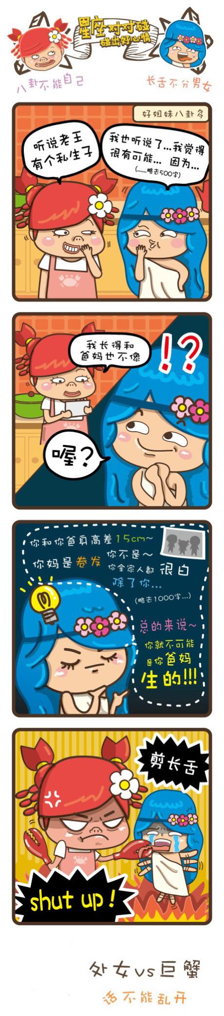 【导语】当巨蟹座人和处女座人在一起会是什么样呢?他们有时说话严厉,有时又会紧盯对方,碰在一起会发生什么效果呢?当他们两人在一起,八卦的功力也是不容小觑,两人旗鼓相当啊!八婆本事立即显现出来。现在一起跟随星座屋小编来看看这组精彩的漫画吧!