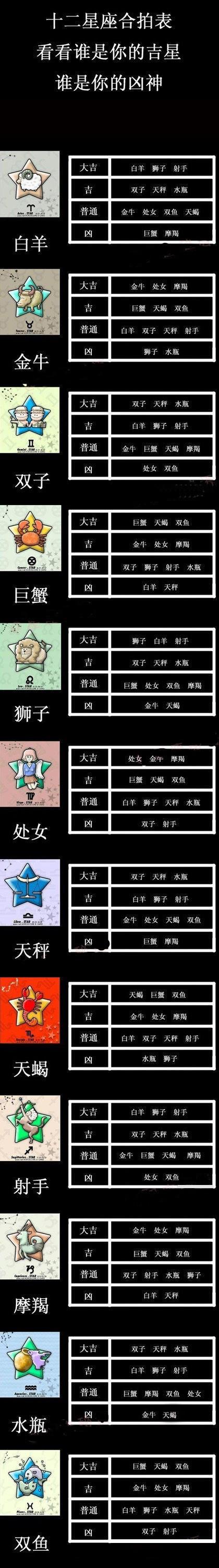 【导语】十二星座每个人的性格都不同,不是每个人都可以搭配在一起,肯定会有人不合群。你是什么星座的呢?你和哪个星座的人最合拍?这次星座屋小编为大家带来十二星座合拍表,看看你到底和谁最合拍,赶紧来找找自己的星座,找出那个人吧!还可以看谁是你的凶星哦!