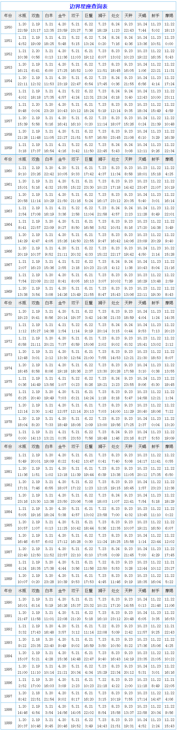 这里是星座屋边界星座速查表,如果你的生日在两个星座的交界处,不清楚自己到底是什么星座,可以在这里查找1950年—1999年太阳进入每个星座的具体时间。