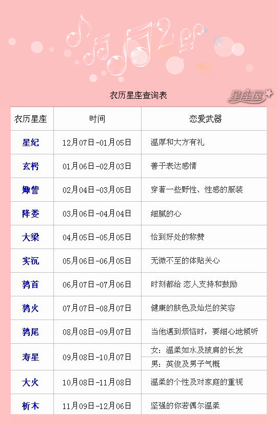 下面请随星座屋来看看农历星座查询表,让你了解自己农历星座究竟会是什么?也附上星座的恋爱武器,让大家清楚认识自己的恋爱特点,助你爱情更加美满!!
