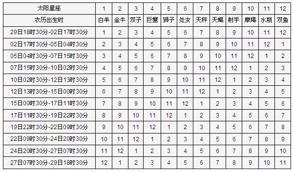 上表的日期都是以农历来计算。举例来说:A为射手座,代码为9。农历生日为 12月12日中午13:30,所以再找12日13时30分-15日00时30分那一栏,对照得“2”而“2”为金牛座,可知 A 的月亮星座为金牛座。