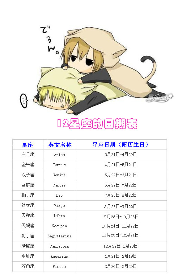 下面就随星座屋去看看12星座的日期表。记忆起每个星座的星座时间段吧。