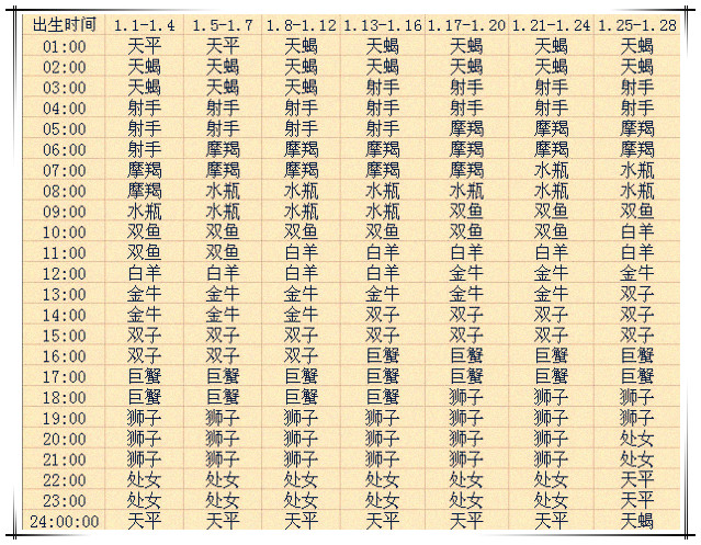 一月出生的12星座上升星座查询表