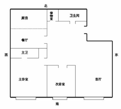 1、此户型图为东北缺角,东北角凹进去了3分1的位置,那么东北角代表着家中的男子,和在商业中的地位,也可称为靠山,如果没有了东北角,那么就象当于没有了靠山、财山和地位,或者是家中的男子不成器。