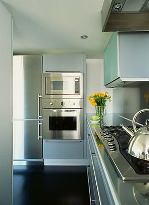 厨房的选色讲究 此外,巧妙地利用色彩,还能创造出视觉上的不同。就拿厨房来说,空间过高,可以用凝重的深色处理,让屋子降低不安感,也看起来比例更和谐;空间太小,用明亮的颜色,运用淡色调,使之产生宽敞舒适感。