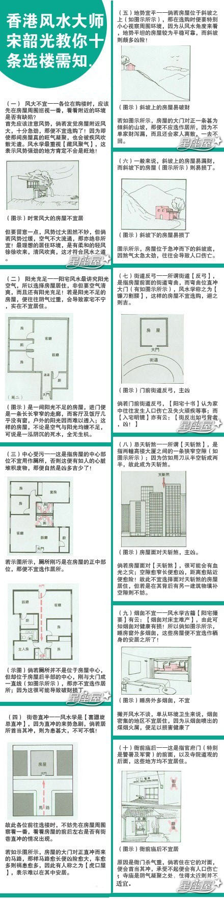 今天星座屋小编和大家分析的是住宅风水图解,现代化的社会,无论在那个地方扎根,都会易置业安居为首选的目标。那么既然为了一头安定的家需要花那么多钱,当然也希望自己的新居不仅能住得人舒适,也能有所人才兴旺的作用。那么怎样才能挑选到好风水的楼呢?现在来看一下香港风水大师宋韶光教大家选楼的图解,大家都来星座屋学习吧!