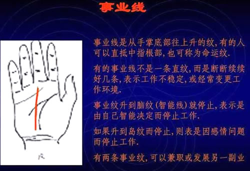 智能线至又称脑纹是掌相中最重要的一纹,中国手相中此纹代表自己,又称人纹。起点与生命线同,向小指方向走,至无名指与小指指缝间停最好,太短不够聪明,太长则精明过度,亦不好。