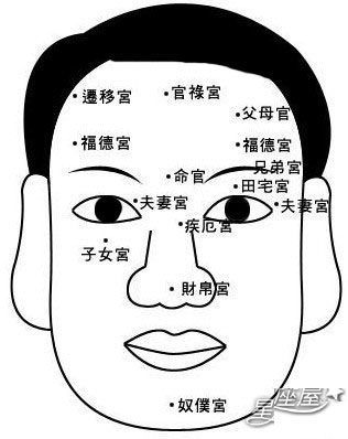 命宫-位于两眉之间“印堂”的部位,看图。影响一个人的基本运势,看图,看图。 财帛宫—位于“鼻头”的部位,看图。主财富的吉凶,看图。 兄弟宫—位于“眉毛”是兄弟宫,看图。主兄弟主吉凶,看图。 夫妻宫—位于“眼尾”部位,看图。主夫妻主吉凶,看图。 子女宫—位于“下眼皮”隆起的部位,看图。象征子女是否有出息以及有无子嗣,看图。 疾厄宫—位于“山根”的部位,看图。主健康方面的吉凶,看图。 迁移宫—位于“上额两端眉际”部位,看图。看迁徙与出门在外的吉凶,看图。 奴仆宫—位于“面颊下端”部位,看图。主交友与部属主吉凶,看图。 官禄宫—位于“额头正中”部位,看图。主事业、官位、学业方面吉凶,看图。 田宅宫—位于“眉与眼中间的眼皮”部位,看图。主家运吉凶,看图。 福德宫—位于“眉上方偏外部”部位,看图。主财运和福气的吉凶,看图。 父母宫—位于父位“左额中间偏上”、母位“右额中间偏上”,看图。主与父母之间的缘分以及吉凶,看图。