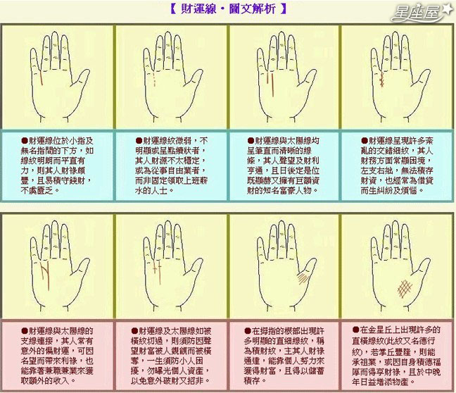 【导语】今天星座屋和大家讲解的是手相面相学解图之财运线。财运线能看出一个人的财运是好还是坏。那么现在跟小编来学习一下吧!