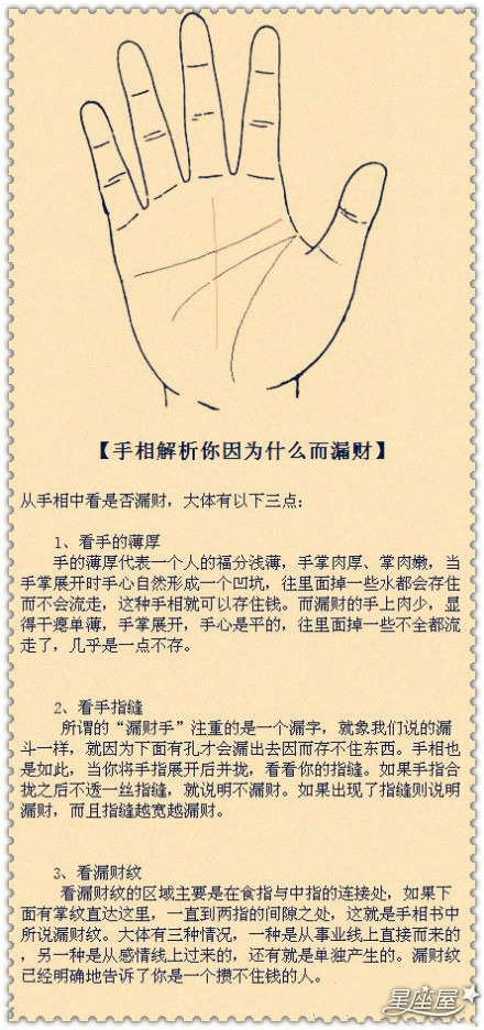 【导语】今天星座屋小编和大家分享的是漏财手相图解,漏财的手相又怎样的特征呢?不如现在跟小编来看看吧!