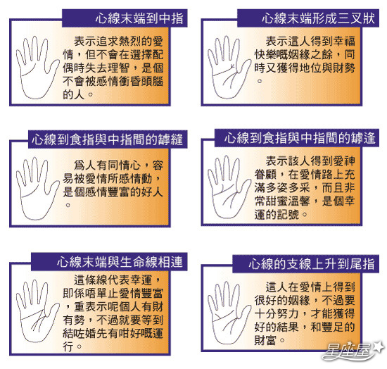 【导语】千里姻缘一线牵,但有时候其实并不需要别人的帮助,你可以看看自己手相中的感情线,你就可以洞悉到自己的感情世界是否一帆风顺,甜甜蜜蜜的。不如现在让星座屋专家,教大家如何看自己的感情线吧!下面看图解让你能更加清晰明白其中意思呢!(注:图中的“心线”,就是指感情线)