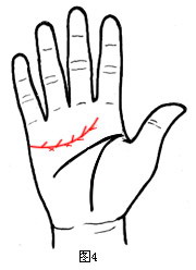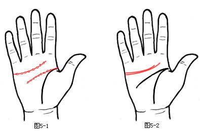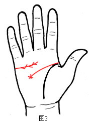 假如三线同源,即感情线末端有一支线下垂,伸入理智线,也是感情线在干扰理智线,但情况较(图6-1)轻微,少了一份糊涂心,却多了一份无谓的牺牲精神,爱情虽美,却带有一些无奈(如图6-2),此特征的人称为“感情牺牲型”,这种人婚前如果失恋过,在婚后反而较安定。感情线末端不喜下垂或有支线下垂,均代表感情上的伤心、挫败;感情线末端若能上升,则表示感情发展顺利,能拥有爱情,并享受爱情。信命虽然是一种人生态度,但这种态度贵在信与不信之间。爱情固然美好,但这种美好贵在真心与付出之间,所以事实上真正聪明的人,是聪明糊涂恰到好处的人