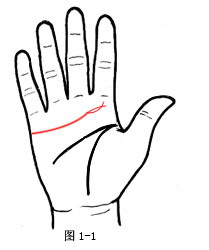 (如图2-2所示),感情线下垂弯曲且长度较短,一般有这种手相的人,自我抑制能力较弱,有吸引异性的本能魅力,对异性容易一见钟情,不计后果。在开始一段感情时,热情冲动的他们很容易爱上对方,也极其投入,犹如烈火一般激情燃烧。可当最初的新鲜感过后,感情就变得不再稳定,一个新的诱惑很容易就会使其见异思迁。轰轰烈烈的爱情才是他们飞蛾扑火的源动力,所以有这种手相的人,一般爱情都不会长久。