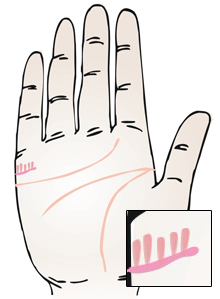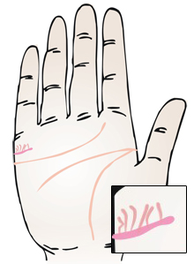 ÊÖÏàѧ֮×ÓÅ®Ïߣº×ÓÅ®ÏßֱͦÃ÷ÏÔ»éÒöÔÚÏßÓÐÇå³þÇÒÖ±Á¢µÄÊúÎÄ£»´ËΪ¶ùÅ®Ïß¡£ Å®×ÓÊÖÉÏÓдËÎÆ£¬“ÒÅ䶯ÂöÎÆ£¬¿ÉÓÉ´ËÅжϿÉÉú̥֮Êý(ÒÔÎÆÇå¡¢Ö±Á¢¶øÂÛ)£¬¶ùÅ®ÍâòÏà¡£ ÄÐ×ÓÓдËÎÆÕߣ¬´ú±í¶ùÅ®ÉíÌ彡¿µ£¬µ«ÈôÎÆÂ·²»Çå»òÓÐÔÓÎÆ¸ÉÈÅ£¬Ôò¶ùÅ®ÌåÈõ¶à²¡¡£