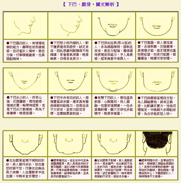 宽圆的下巴者:爱情圆满,顾家,热心工作,乐于照顾别人,好色,性器强壮,心情温和,和悦性格。 方角的下巴者:干劲十足,刚毅果断,盲目冒进,抢先心重,明破灭性格,彻底的合理主义者,对喜欢的女性爱护备至。 凹凸的下巴者:和气,感受性敏锐,伤感的,思想稳健。 双层下巴者:爱情丰富,温厚马实,包容力强有财气,无强烈意志,沉着,有常识。 阔腮的下巴者:蛮干,爱情专一,不屈不挠,进取型的。 突出的下巴者:个性强,斗争的,性急而行动自尊心强,转为仇敌则可怕。这类下巴的女孩子性格过于男性化。 林青霞式的下巴(中间一条竖纹)者:女性则是无住屋的烦恼,而男性条纹愈多烦恼愈多,颚上有十字纹,容易惹上官司。 |