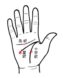 星纹:在手掌上由三条或者三条以上短短的纹路交叉而成,似星星闪闪发亮,有星星的形状。同理不同部位就以为着不同的命运好坏。