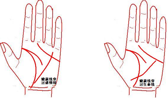 2、健康线穿过生命线,或者和生命线相交,则表示这个人外强中干,内脏或者血液循环系统可能出现问题,容易患脑血管疾病,高血压,糖尿病等。而且个性比较固执。