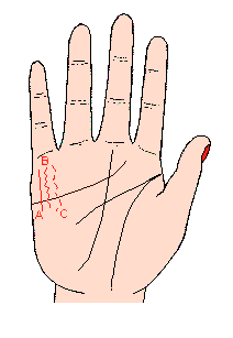 如果一个人的手相中的财运线如(C号线)一样断断续续,可能说明此人金钱运较差,生活遇到许多困难和阻碍,生意不顺心。若此人性子较急躁,缺乏耐性只会让情况变得更糟糕,应该多加忍耐,学会控制自己,清晰分析情况避免更大的损失。
