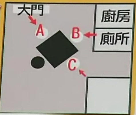 3.迎门不要背门 迎门是迎财神来,所以你应该看着财神来,不要背着财神。 看图,A的位置为背门,不好的位置。你要坐的位置是不要背着门的位置,财神来要迎门,不要背门。 4.勿在厕所门前 图上的B位,第一,财神爷不喜欢,财神不喜欢靠近你,因为那地方很臭。 第二,每个人上厕所,会朝你背后去看一下,走过去在你的背后。 5.芒刺在背 图上的C位,他刚好一个墙壁是一个尖角,尖角刚好刺向你的背后,你就感觉有个压力在背后刺着你,这个位置最好也是避免。 |
