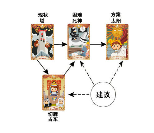 代表困境的牌是死神,表示问卜者的爱情已经发生了变化,他与这个女孩可能存在着个性的不合,另外他还并不被那女孩信任,以过了这次求爱而对方巧妙地回避,两个内心的隔阂有所加深。