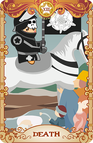 死亡牌描述四种面对死亡或改变的态度。国王代表一个拒绝改变的人,因此它会被生命的浪潮扫到一边。主教站着面对死亡,以他的精神信念支持即将发生的改变。