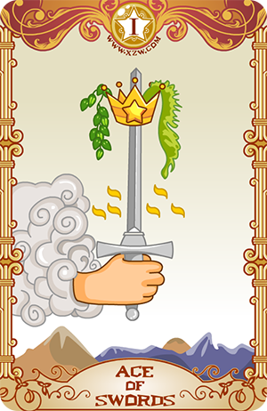 宝剑王牌代表的是一个开始,时涉及以相信冒险或方案的行动。权杖王牌描述身体上的行动,杯子牌的王牌则是情感上的行动,而这张王牌叙述一个意念的形成,或是为未来的行动所准备的计划。